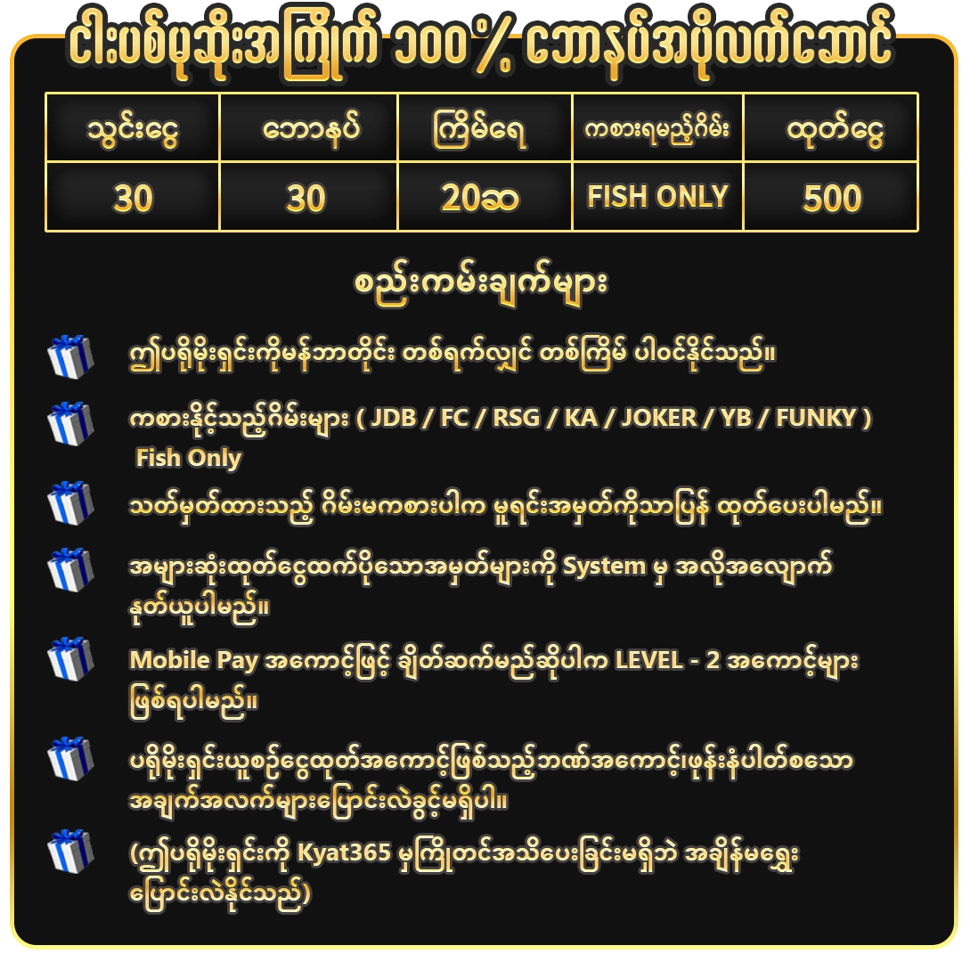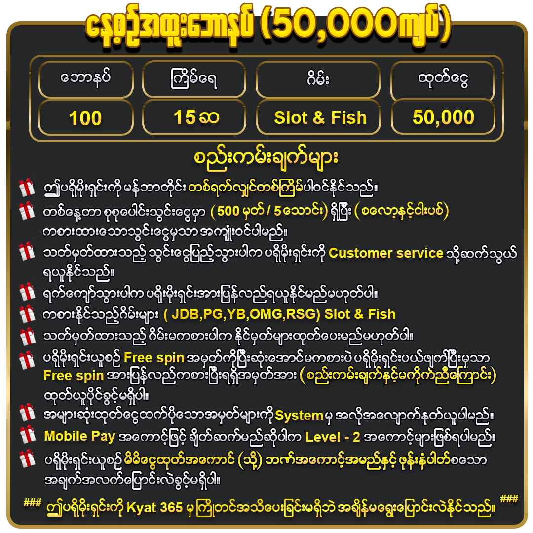 | ၅,၀၀၀ က်ပ္(၅၀ယူနစ္) | ၂၀ဆ | ၁၀,၀၀၀က်ပ္ |