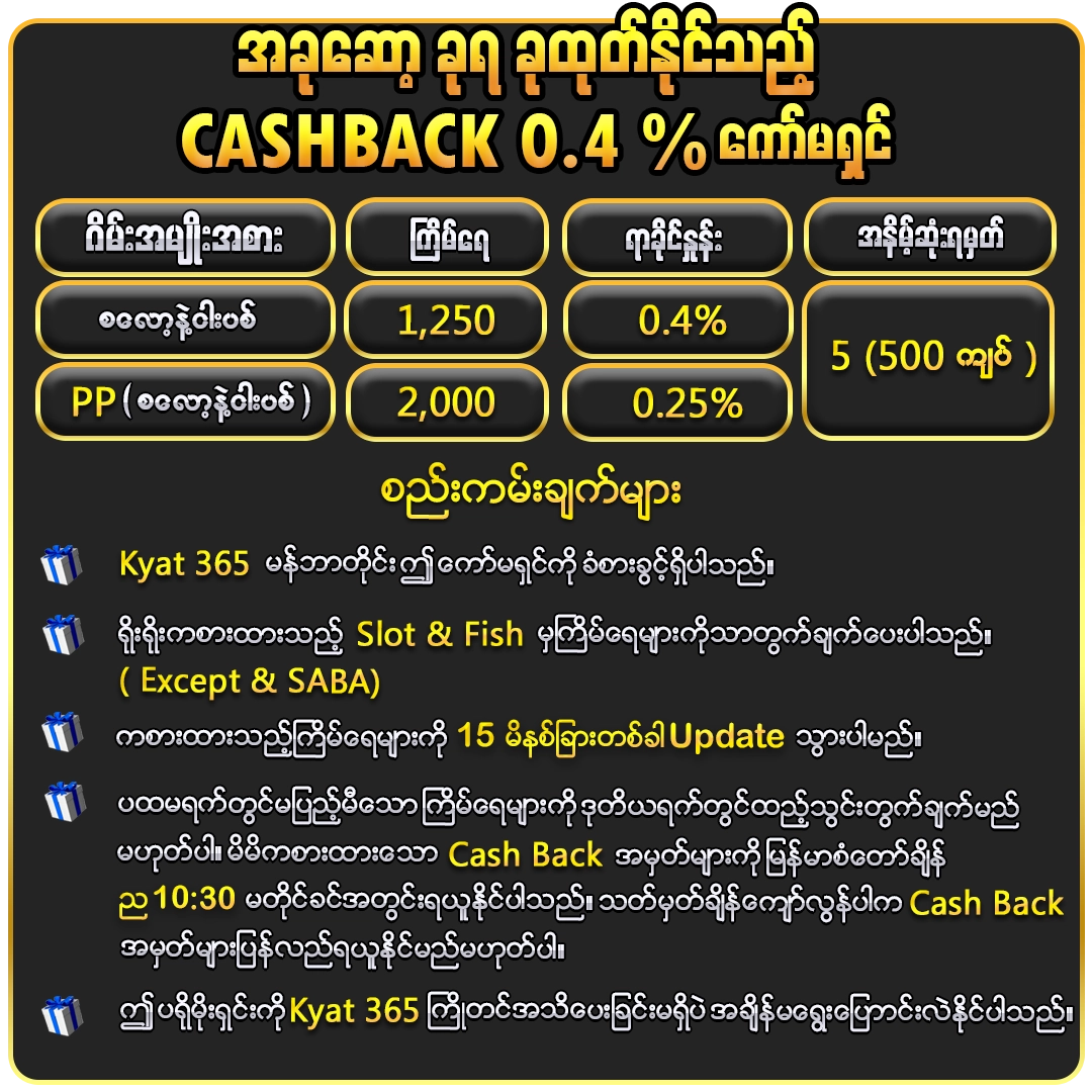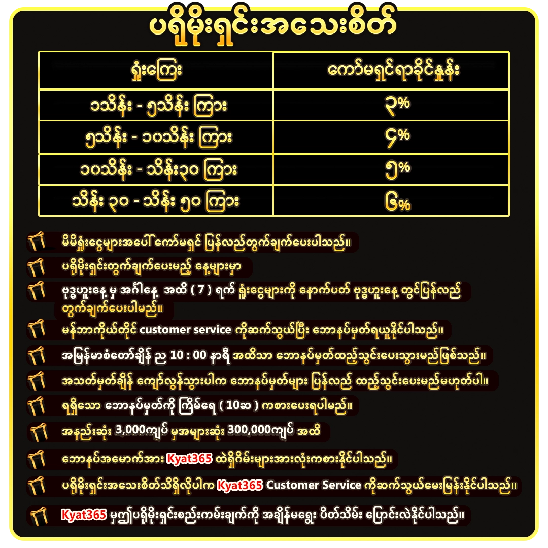 4.Kyat365 မွဤပ႐ိုမိုးရွင္းစည္းကမ္းခ်က္ကို အခ်ိန္မေ႐ြးပိတ္သိမ္း ေျပာင္းလဲႏိုင္ပါသည္။